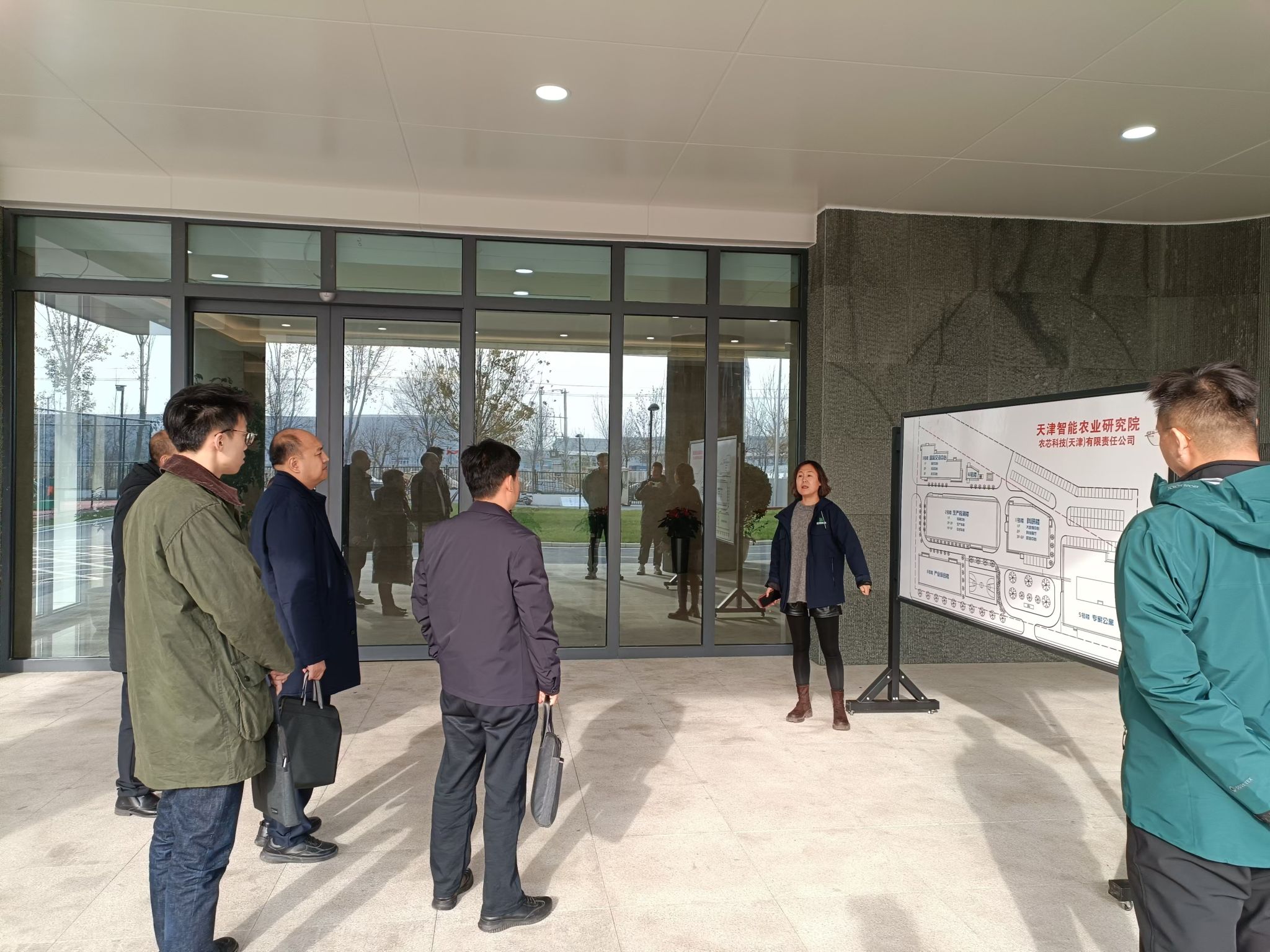 天津智能农业研究院副院长穆飞介绍天津智能农业研究院的建设情况,陪同参观了智能装备检测实验室,电路板实验室,番茄栽培实验温室,田间作物表型检测平台、科普展厅等。